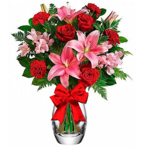 Este suntuoso bouquet é composto com flores en tons de vermelho (rosas, cravos, etc) e flores em tons de rosa (lírios, alstroemérias, etc), folhagens especiais e é decorado em tons vermelhos e vibrantes. Produzido com flores frescas e selecionadas, sujeitas por isso à substituição por flores equivalentes conforme a localidade, esse produto é confeccionado localmente na data da entrega com todo carinho por nossos floristas locais. Assim as flores não sofrem com viagens em longas distâncias, preservando sua qualidade, frescor e perfume.