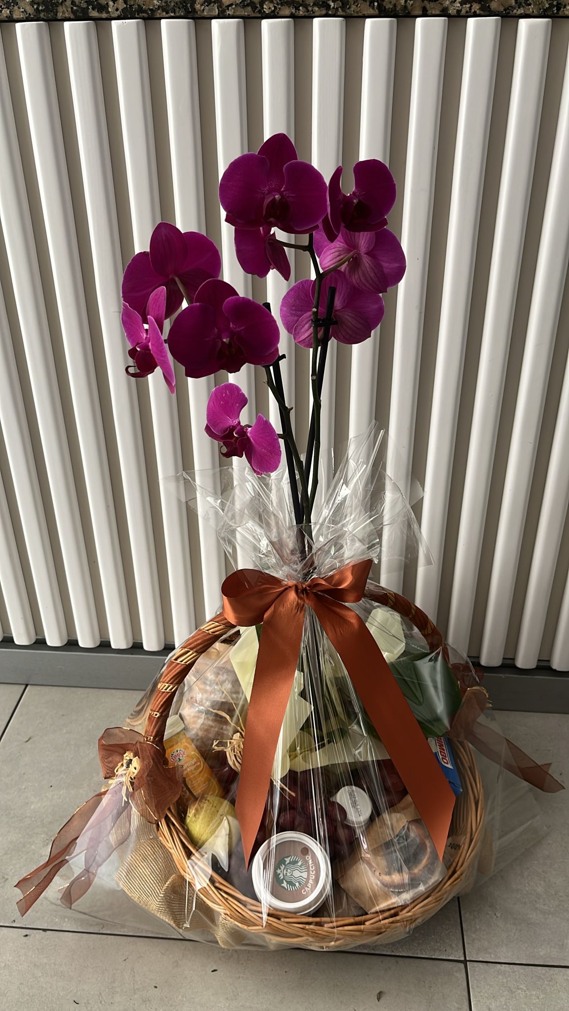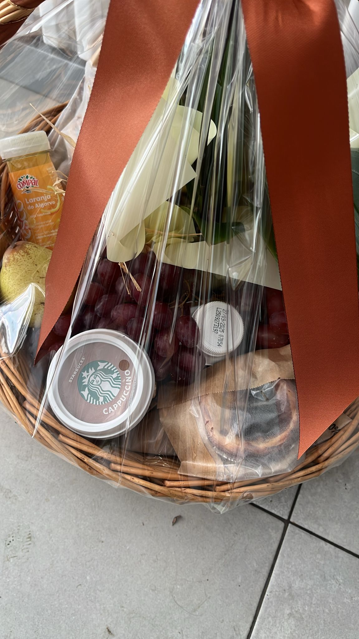 Um belo Café Manhã com Orquidea Frutas e ChocolatesCafé Manhã com Orquidea Frutas e Chocolates é sempre uma óptima opção para presentear, para homenagear, para sair da rotina e para surpreender: envie sua mensagem especial, demonstrando carinho, afeto e gratidão! Esta delicada Cesta de Café da Manhã Delicado inclui uma cesta de vime e é embalada sofisticadamente. Contém items como:1 Leite Chocolate vigor(200ml);1Bebida Láctea Cappuccino1 sumo Laranja natural(200ml);1 Barra de cereais (30g);1 pão (30g);1 pacote de tostas Bimbo (160g).1 Iogurt Danone (280ml);1 Bolinho Muffin de Chocolate ou Pastel de Nata (40g);1 pacote de Cookies Chocolate (60g);1 Croissant Chocolate (40g);1 caixa com 8 bombons Ferrero Rocher ou Guylian frutos do mar (100g);3 tipos de frutas ( maçã, maçã verde, uvas ou pêra )Um delicado arranjo com Orquidea.Itens sujeitos à substituição por produtos equivalentes conforme disponibilidade na cidade de entrega. Entregas rápidas até no mesmo dia em Portugal!