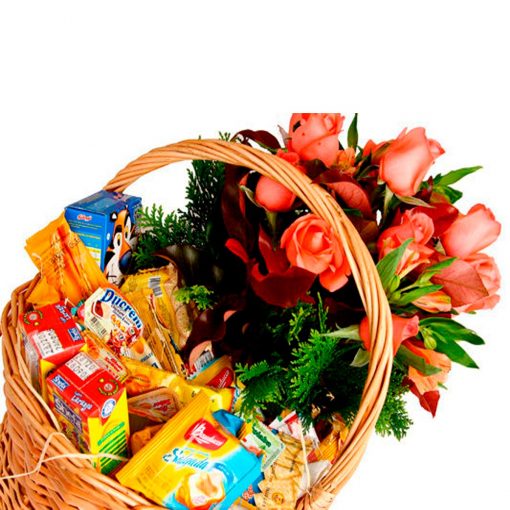 A Cesta Café da Manhã Apaixonado inclui uma bela cesta de vime com um arranjo de rosas vermelhas e alstroemérias ou de flores do campo, com uma caixa de bombons Ferrero Rocher e com produtos para um delicioso café da manhã: